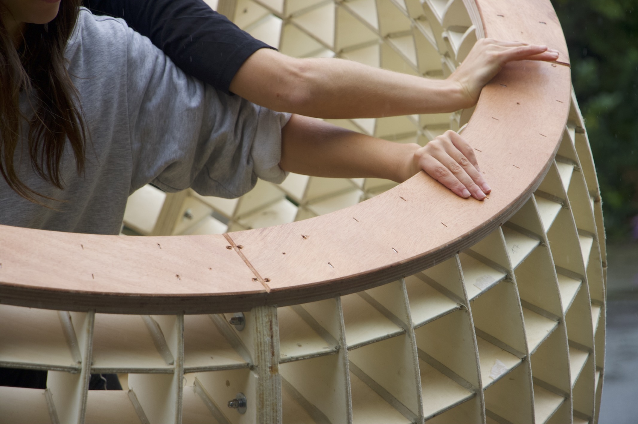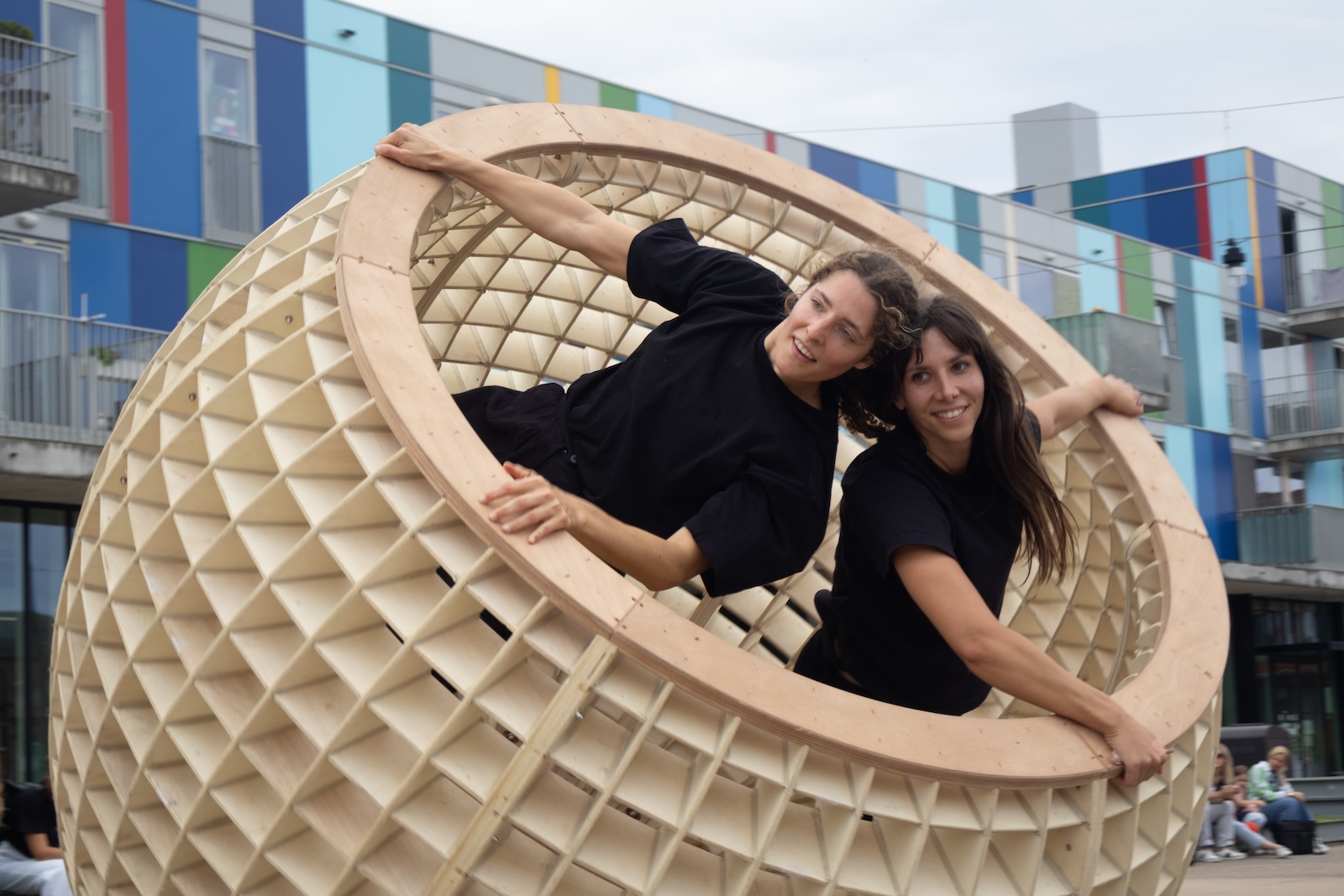 Colossal Module is a kinetic sculpture made of wood, with a base filled with sand. This installation functions as an interactive object that explores the boundaries between sculpture, play object, and functional design. It invites viewers to crawl inside, hang on it, and move through the space. The physical interaction of the viewer transforms the installation into a performance. The object stimulates play, experimentation, and creativity.