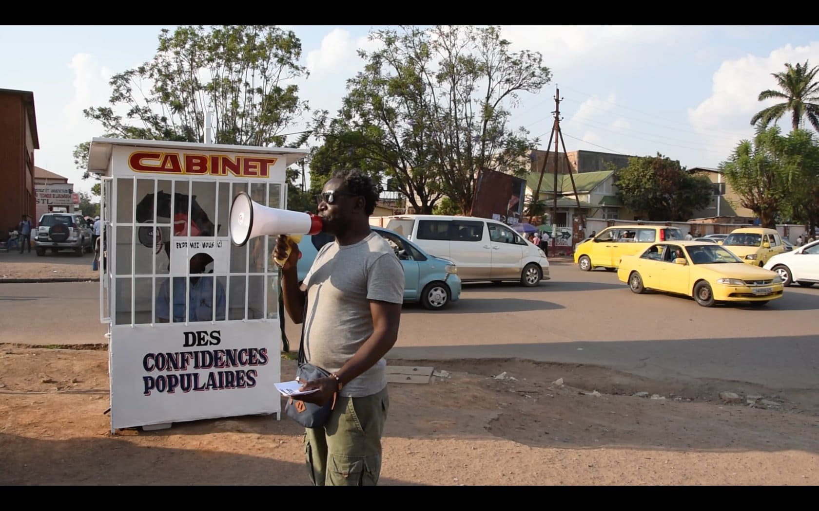 Transforming a Congolese street vending booth into a platform for popular critique, Baba-Ali reclaims this everyday object as a tool to amplify local voices. Installed across Lubumbashi’s city center, the Cabinet de confidences populaires — or Booth of Popular Confessions — gathers messages of discontent from residents through a young man seated inside, performing the role of an official clerk.