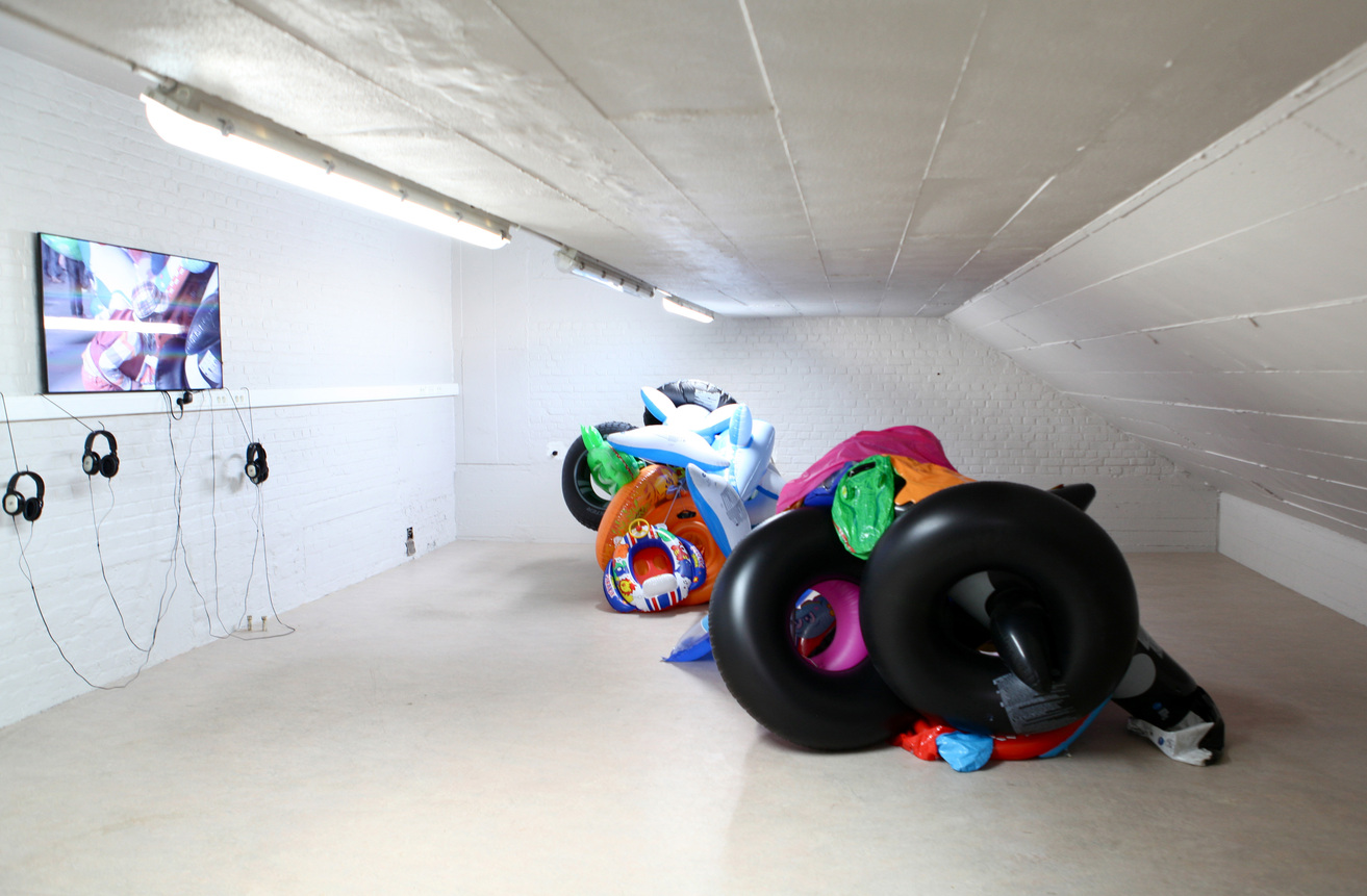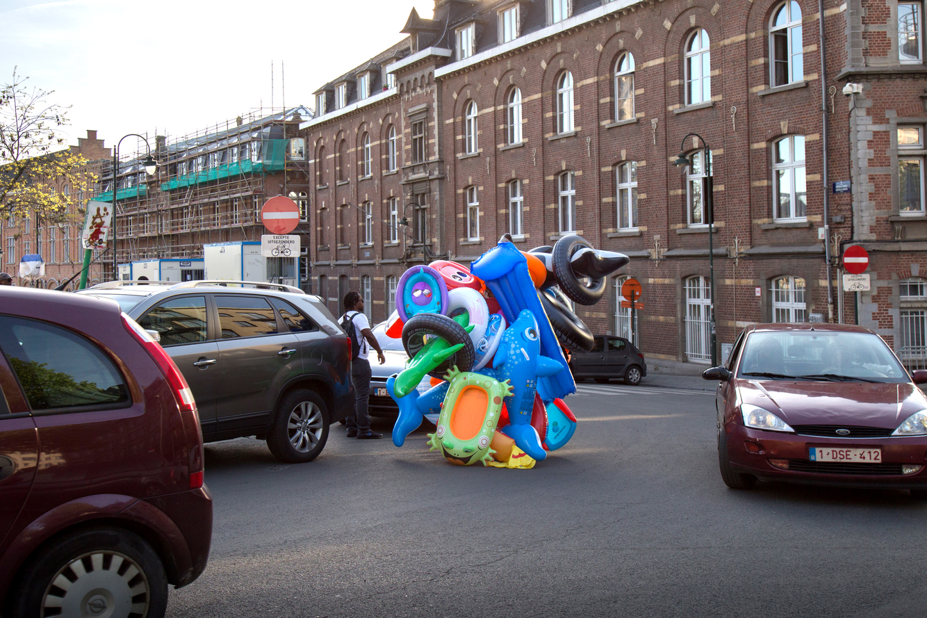 In this performative work, the artist explores how circulation, exchange and exhibition create artistic value while juxtaposing two seemingly opposing markets: the art market and the street market.The performance humorously blends their respective social customs and settings by having an inflatable toy salesman wander through artistic contexts or public space.